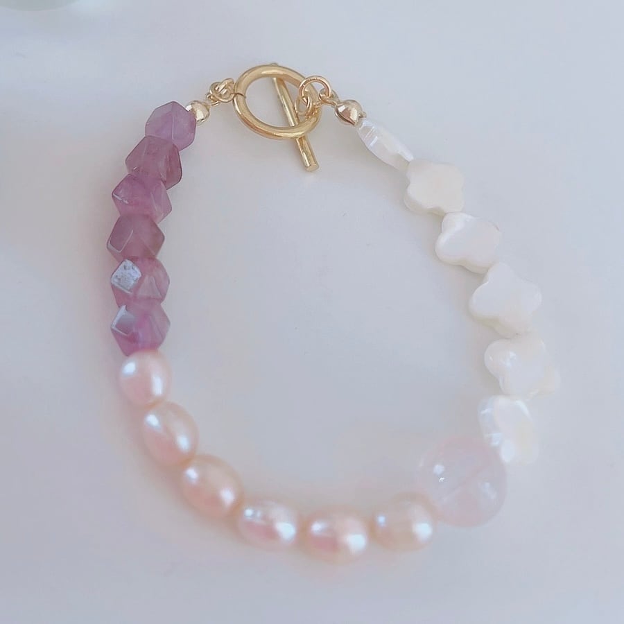 フラワーカットのマザーオブパールとパールのエネルギーが混じり合うことで、柔らかな女性らしさを纏います。