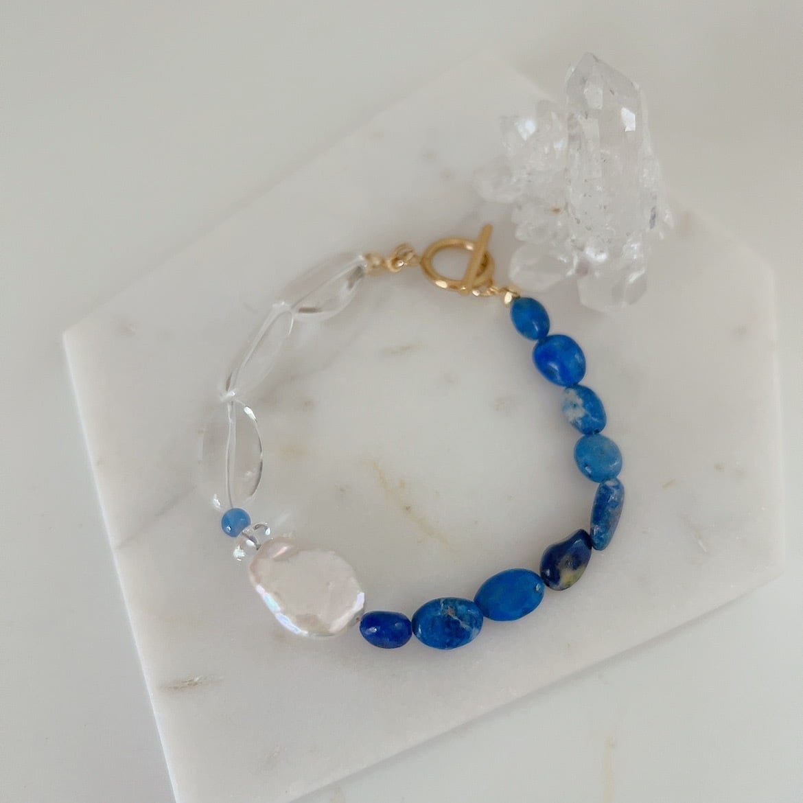 美しいオーロラパールでラピスラズリとクリスタルを優しく繋ぎました。
