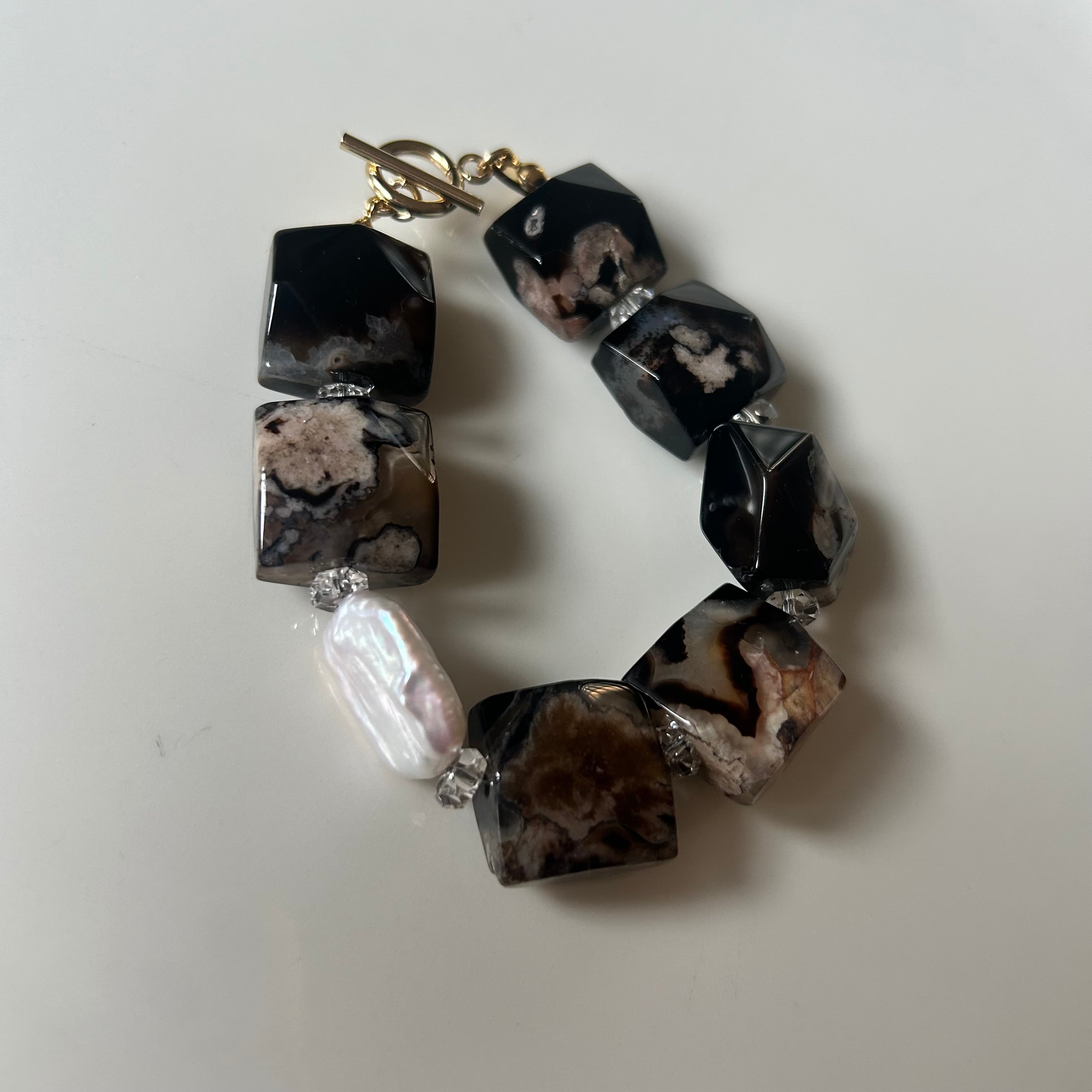 ブラックフラワーアゲート×パール×クリスタル ブレスレット
