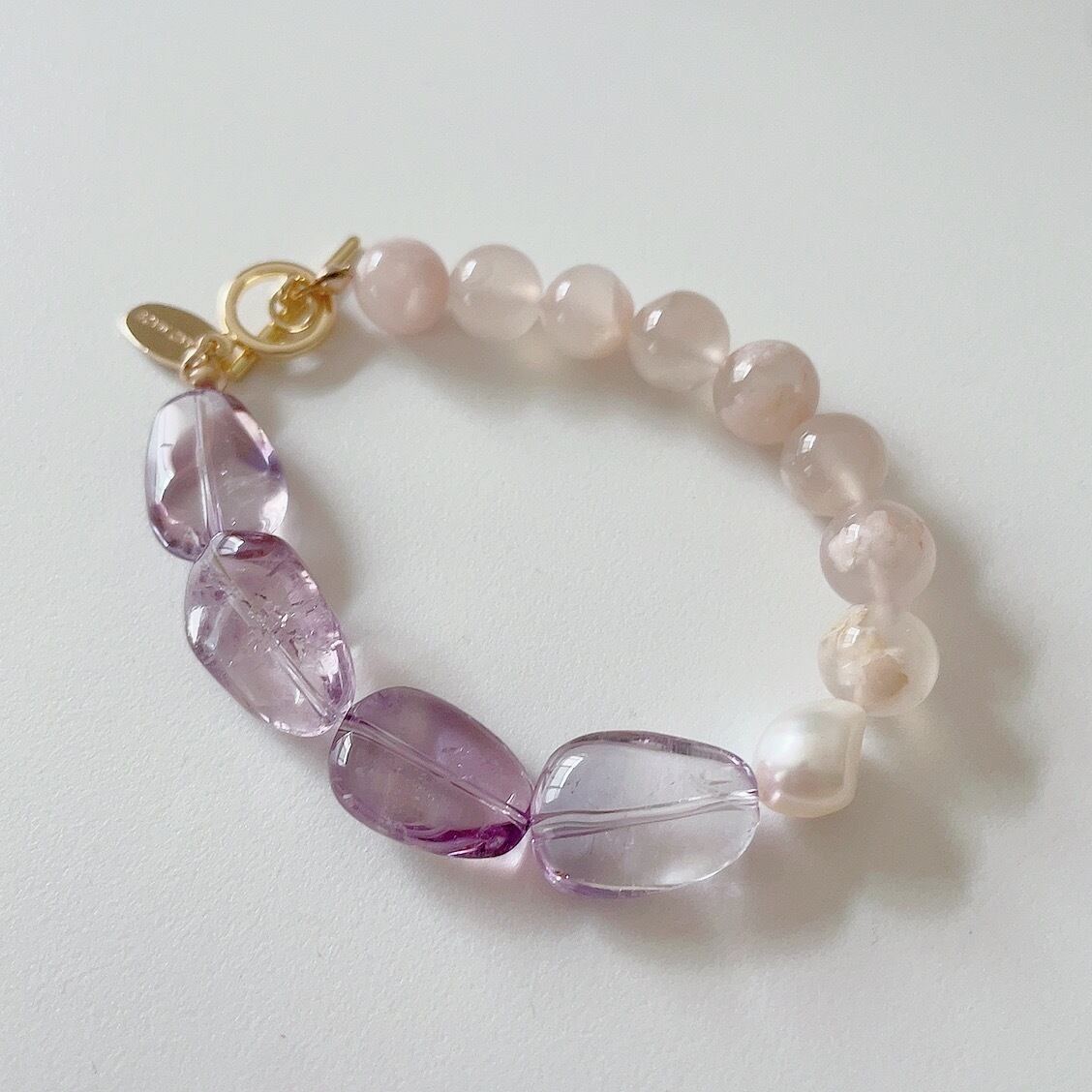 フラワーアゲートとアメジストをパールで繋いだ優しい雰囲気のブレスレットです。